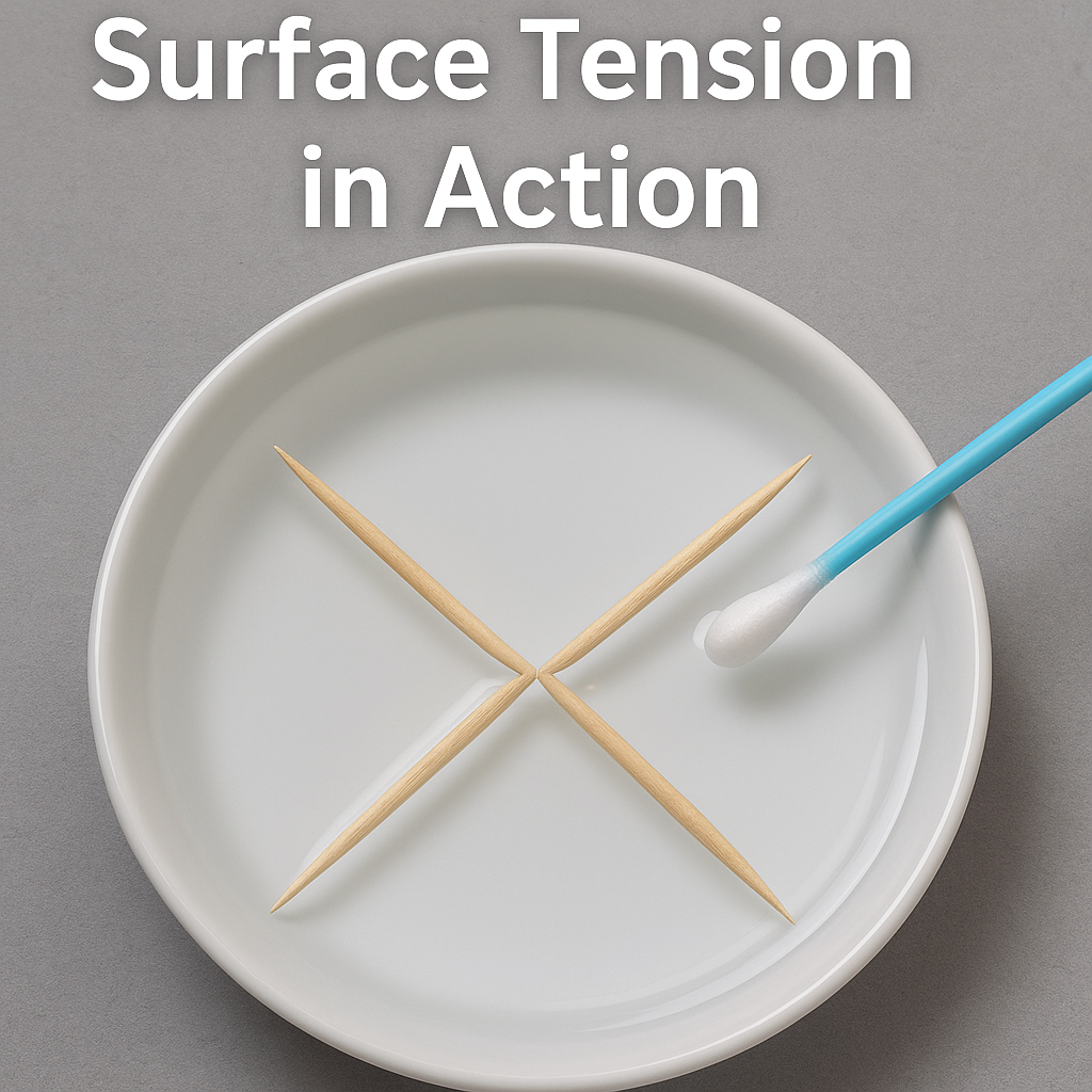 This illusion of motion is all thanks to surface tension, a property of liquids that allows the surface to act like a stretched elastic sheet. Water molecules at the surface experience cohesive forces pulling them inward, creating a tight surface “skin.” When you break this uniformity—say, by adding soap—water rushes away from the disturbance, dragging anything floating on it, like toothpicks, along for the ride.